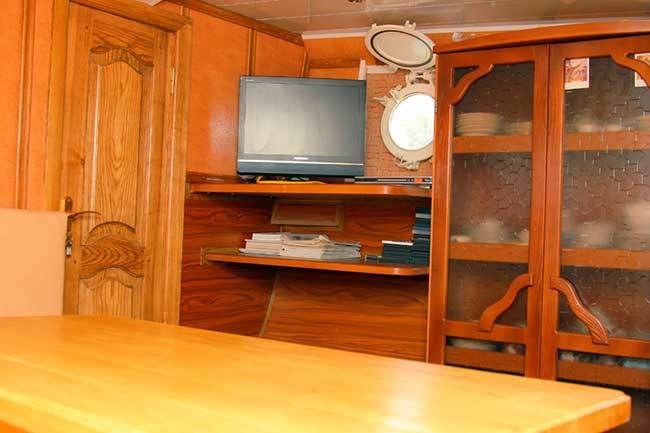 На теплоходе верхний носовой салон стилизован под кают-компанию. Она снабжена мебелью для отдыха, телевизором, видеоцентром.